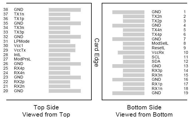 光インターフェースポートはオス型MPOコネクタです。図2に示すように、左側の4つのファイバー位置(キーを上にした状態)は、光送信信号(チャネル1~4)に使用されます。右側のファイバー位置は、光受信信号(チャネル4~1)に使用されます。中央の4つのファイバーは物理的に存在します。